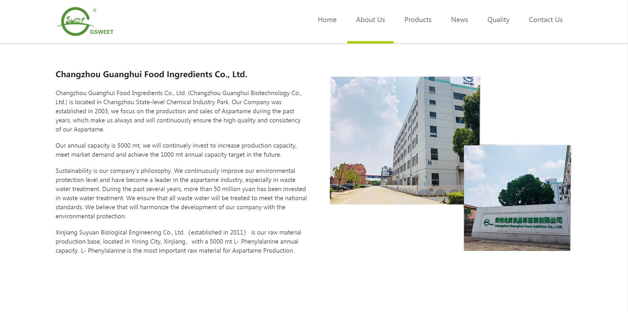 Changzhou Guanghui Food Ingredients Co., Ltd. (Changzhou Guanghui Biotechnology Co., Ltd.) is located in Changzhou State-level Chemical Industry Park. Our Company was established in 2003, we focus on the production and sales of Aspartame during the past years, which make us always and will continuously ensure the high quality and consistency of our Aspartame.